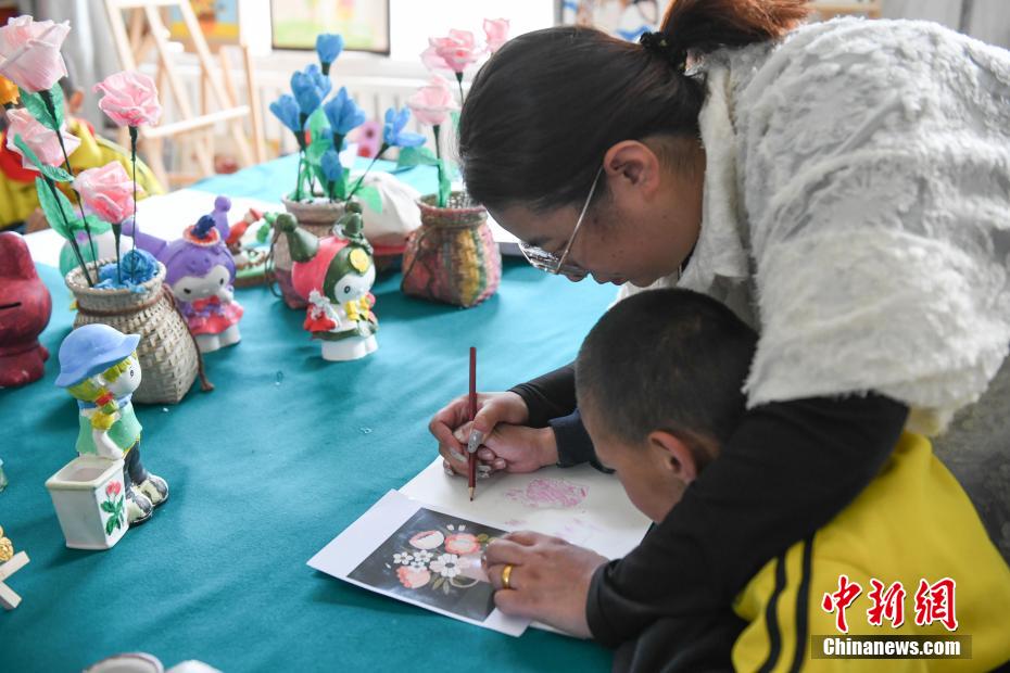 圖為那曲市特殊教育學(xué)校老師教學(xué)生畫畫。貢嘎來松 攝