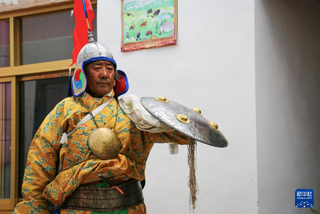 在赤德村,流傳于此的宮廷禮儀舞蹈“仲”舞,距今已有百年歷史,其中一幕是舞者頭頂青稞酒壺給客人敬酒,以體現(xiàn)崇高的迎客禮儀。在西德村,“果爾孜”舞的“將士們”身著盔甲、頭戴頭盔、手持劍盾,和著由慢漸快的鼓聲,贊美出征的將士、崇拜保家護(hù)國的兵器……