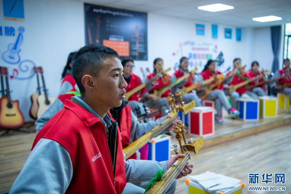 圖為那曲市高級(jí)中學(xué)學(xué)生在彈奏扎念琴(9月5日攝)。新華網(wǎng) 旦增努布 攝