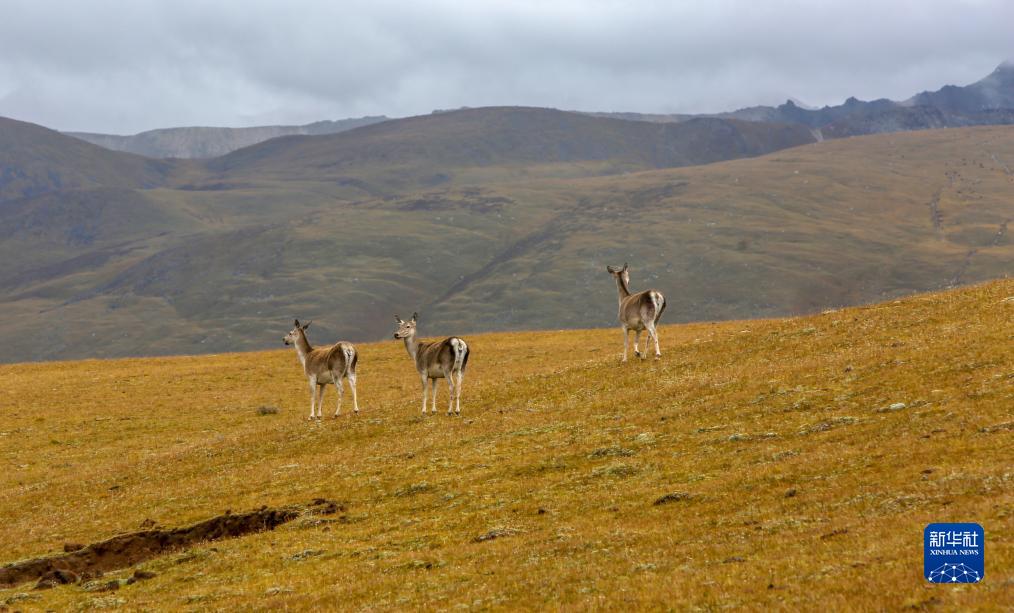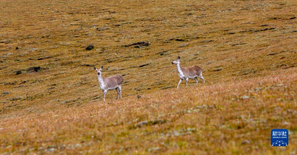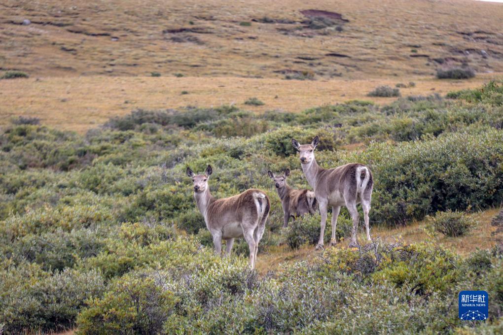 9月24日,幾只西藏馬鹿出現(xiàn)在位于西藏自治區(qū)山南市桑日縣的貢德林草原上。新華社記者 邵澤東 攝