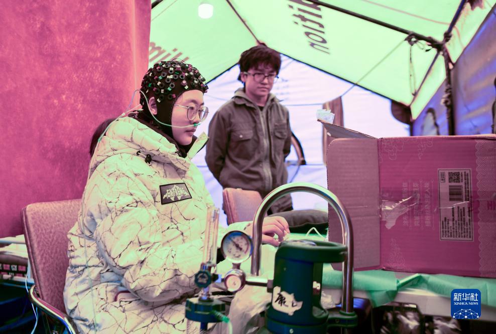 在卓奧友峰登山大本營,中科院院士朱彤佩戴全腦彈性測(cè)試帽,測(cè)試人體認(rèn)知能力(10月1日攝)。新華社記者 晉美多吉 攝
