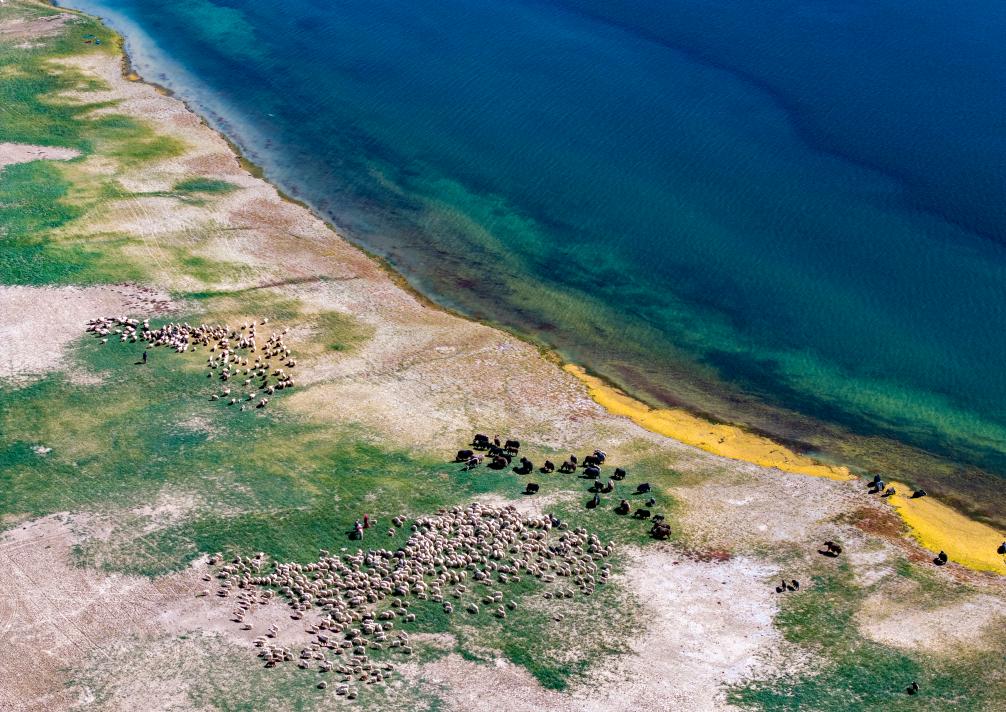 牧民在阿里地區(qū)日土縣班公湖畔放牧白絨山羊和牦牛(無(wú)人機(jī)照片,9月21日攝)。新華社記者 姜帆 攝