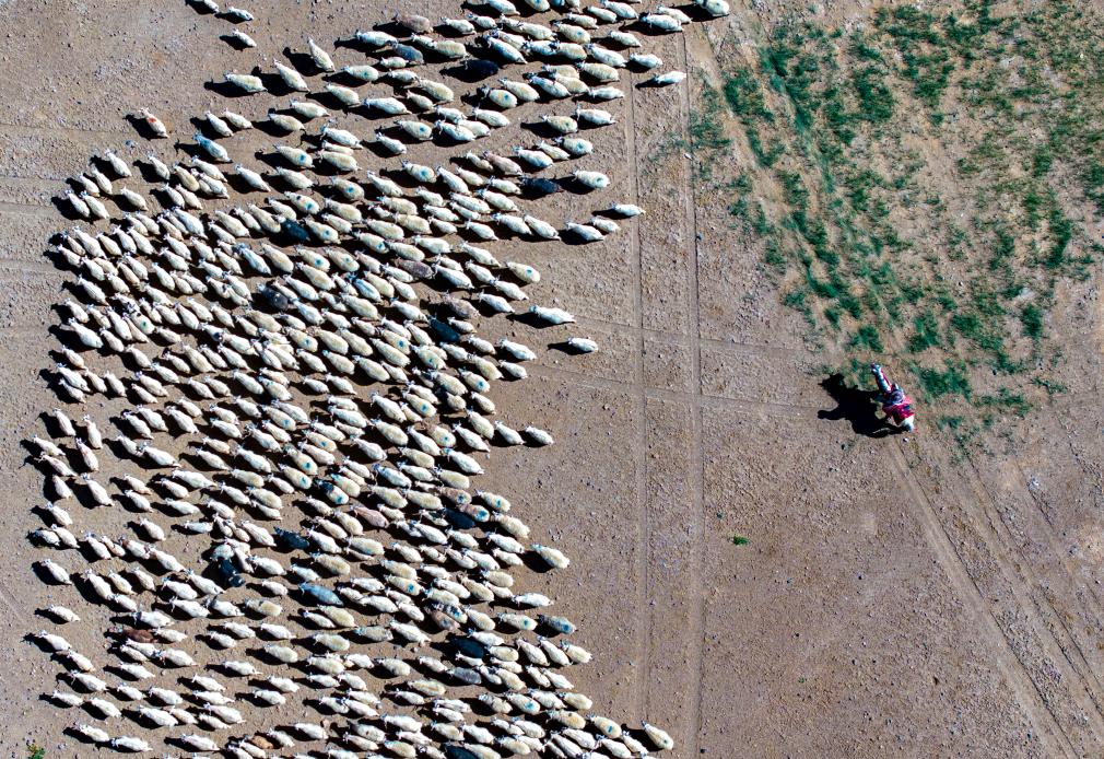 牧民在阿里地區(qū)日土縣班公湖畔放牧白絨山羊(無(wú)人機(jī)照片,9月21日攝)。新華社記者 姜帆 攝