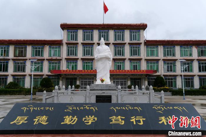10月12日,西藏藏醫(yī)藥大學校園內(nèi)矗立的藏醫(yī)藥學祖師宇妥·寧瑪云丹貢布雕像和藏漢雙語鐫刻的校訓。中新社記者 江飛波 攝