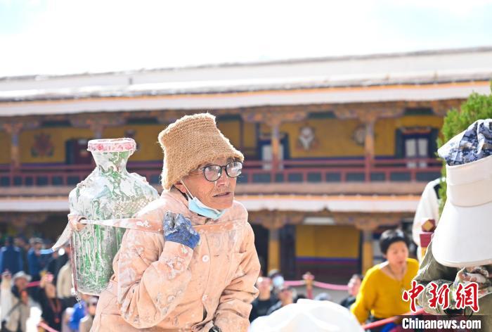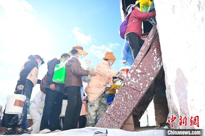 參與到粉刷中的民眾有序運送或潑灑涂料???0歲的丹巴渾身沾滿了白色涂料,小憩間盤腿席地而坐,正在喝甜茶的他,還不忘熱情招呼記者品嘗。這位老人原是布達拉宮的木匠,工作了28年。退休后,每年布達拉宮粉刷,他幾乎都要來參加,覺得來布達拉宮像回家一樣親切。他說:“以前都是口頭通知喊大家過來,現(xiàn)在網(wǎng)上一發(fā)消息,大家都主動參加?!?/p>
