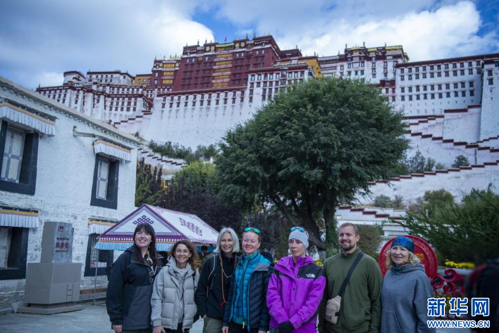 10月18日,外國(guó)游客在布達(dá)拉宮前合影留念。新華網(wǎng) 旦增努布 攝