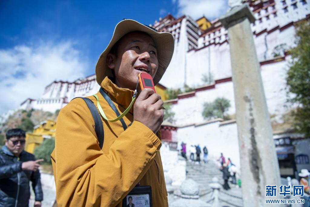 10月18日,一名導(dǎo)游在向游客講解布達(dá)拉宮歷史。新華網(wǎng) 旦增努布 攝