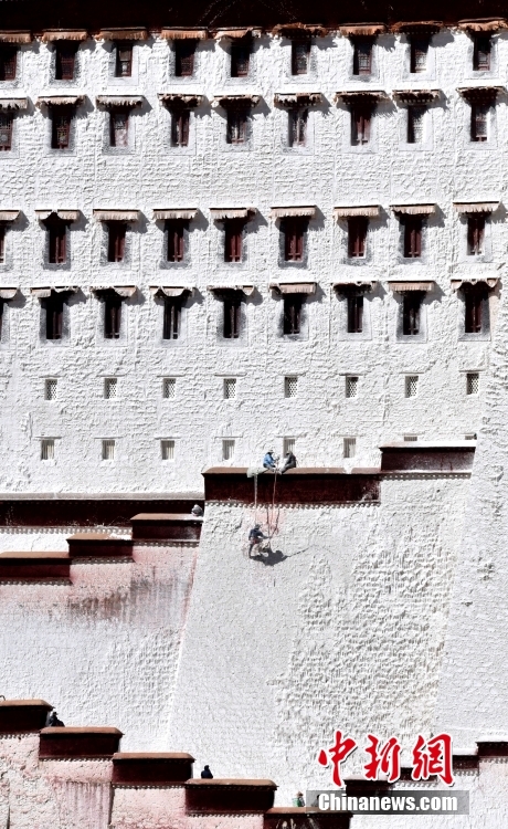 10月19日,西藏拉薩,工作人員對(duì)布達(dá)拉宮外墻噴灑涂料。每年秋冬交替時(shí)節(jié),布達(dá)拉宮外墻都要進(jìn)行粉刷“美顏”。按照慣例,每季粉刷將在藏歷9月22日“神降節(jié)”前完成。