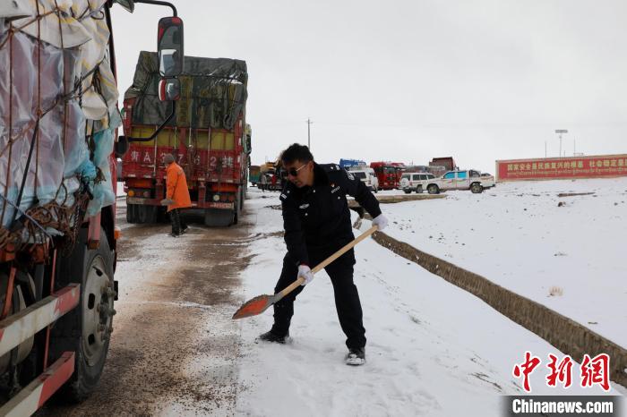 “現(xiàn)在唐古拉山路段處于不間斷堵車狀態(tài),昨天我們這一隊是從下午開始除雪保通,持續(xù)到今天凌晨4點左右才全部疏通?!?1日下午,中新網(wǎng)記者連線西藏安多縣公安局交通管理中心秩序中隊隊長達娃云旦,他介紹,10月17日以來,國道109線唐古拉山段持續(xù)降雪,積雪結(jié)冰,道路通行受阻。安多警方“以雪為令”全力救援被困乘客、車輛,進行除雪保通。