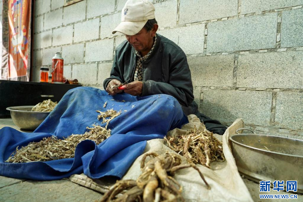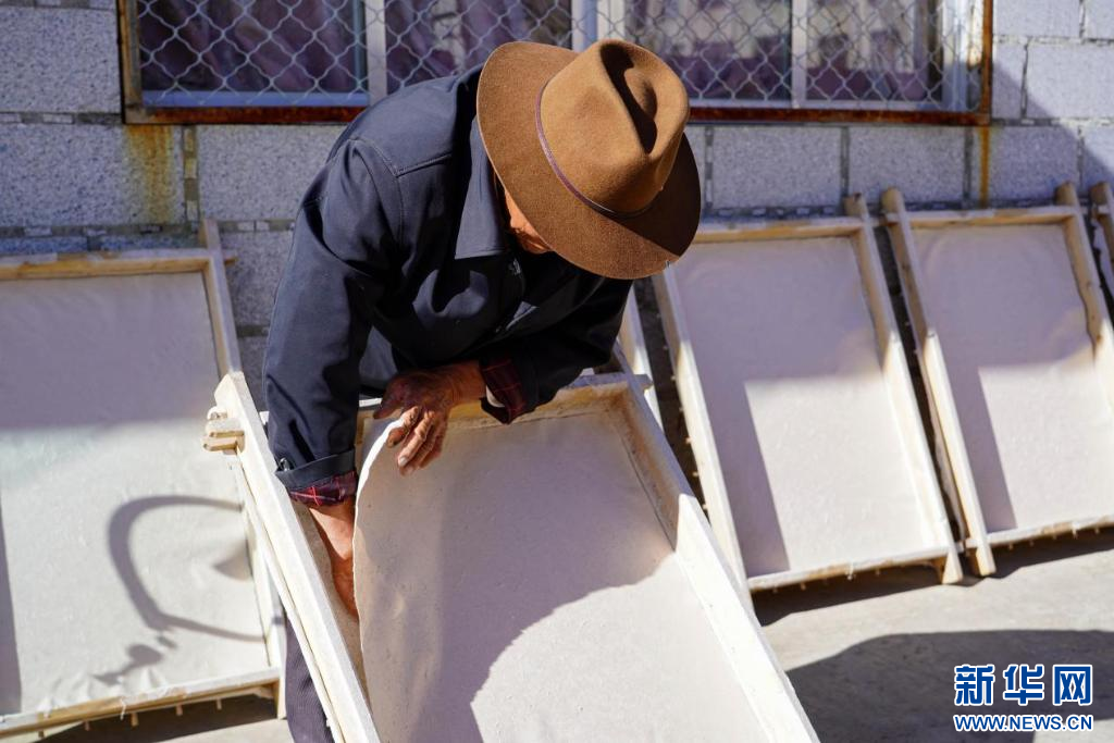 圖為雪拉村村民正在為藏紙?jiān)侠嵌静萑テぃ?0月20日攝)。新華網(wǎng)發(fā) 司秦菱 攝