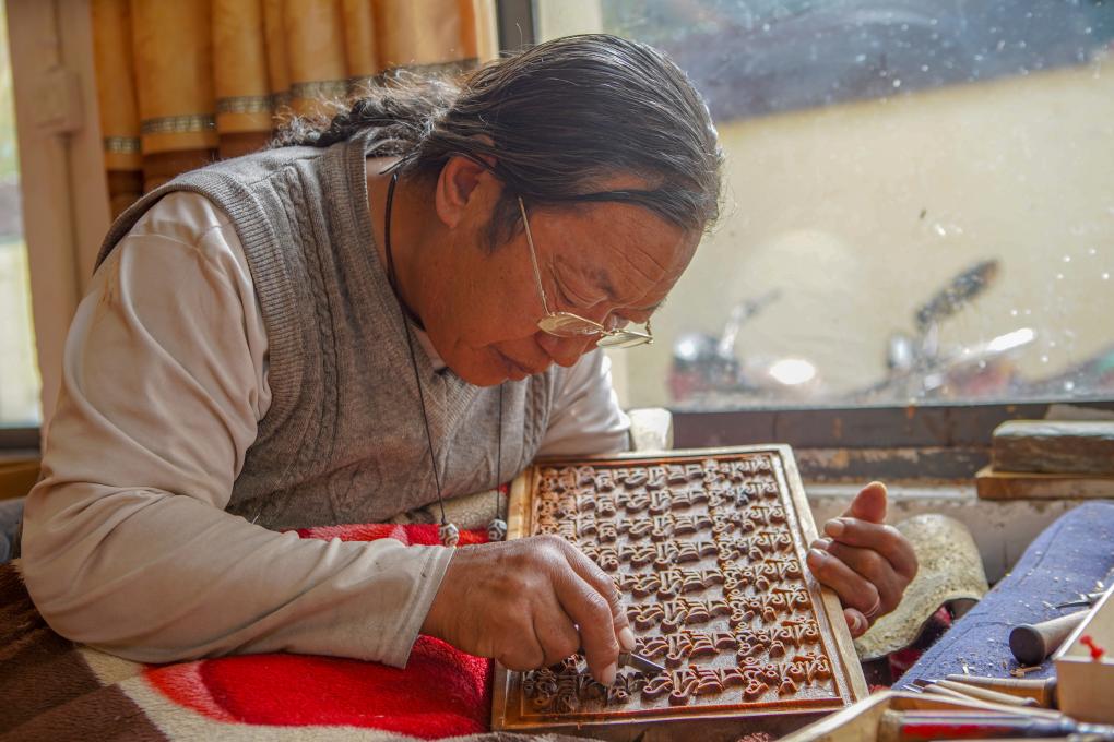 一手緊握刻刀,一手托住木板,刀起刀落間,木屑剝落,一件件樣式精美、色澤瑩潤的雕刻成品躍然眼前。在西藏昌都市江達縣波羅鄉(xiāng)外沖村,“波羅古澤刻版制作技藝”國家級傳承人澤培正在認(rèn)真指導(dǎo)學(xué)徒制作木刻。