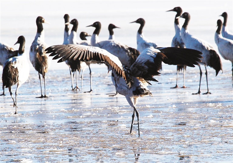 一群黑頸鶴在拉薩市林周縣濕地里嬉戲。記者 姚海全 攝