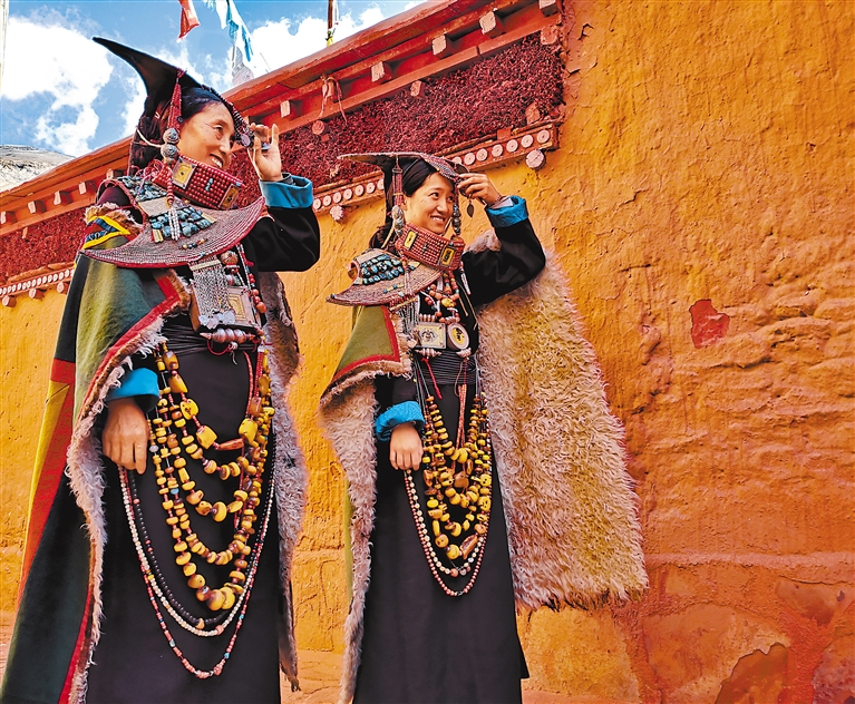 在科迦寺前,面對(duì)游客的鏡頭,身著“飛天服”的巴桑倉(cāng)決和巴桑普赤吟唱古老的“宣”歌,跳起曼妙的“宣”舞。驚鴻一瞥中,這套穿在身上的非遺,穿越千年,煥發(fā)出新的光彩。(記者 周輝 婁夢(mèng)琳 馬國(guó)英 姚海全 普瓊 拉巴卓瑪 溫凱 洛桑旦增)