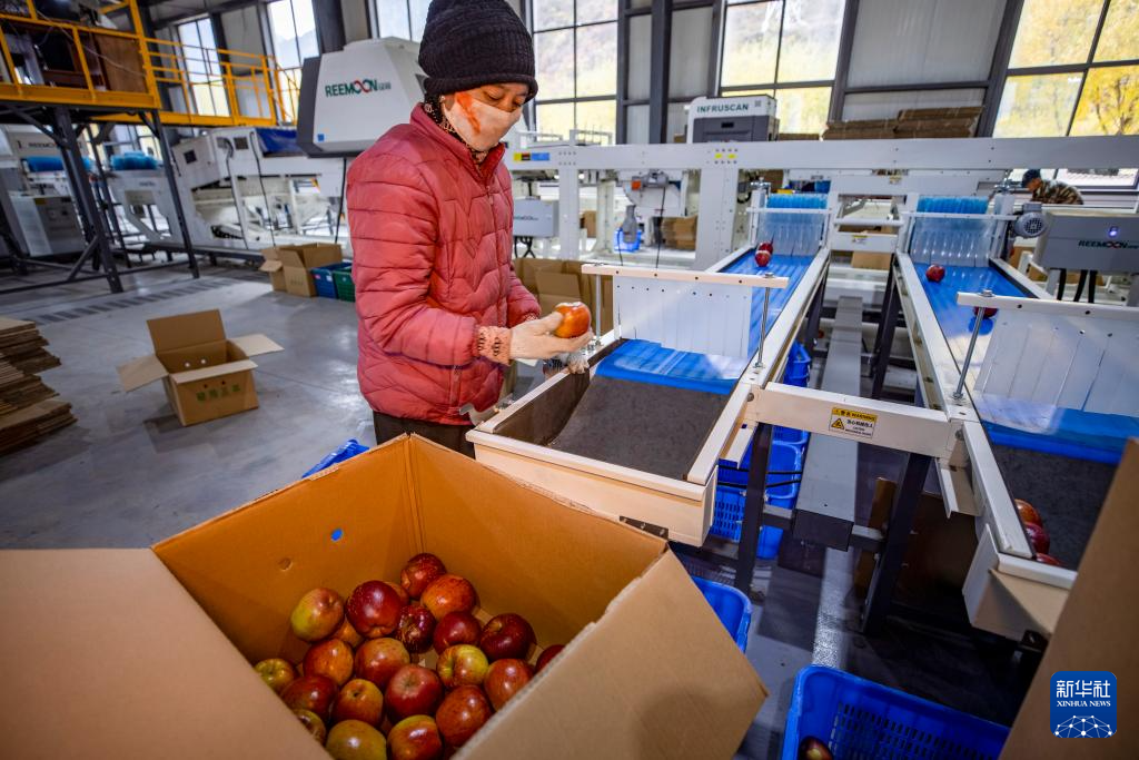 米林市羌納鄉(xiāng)西藏林芝現(xiàn)代蘋果標準化園區(qū)分揀車間內(nèi),工人在流水線上分揀蘋果(11月13日攝)。新華社記者 姜帆 攝