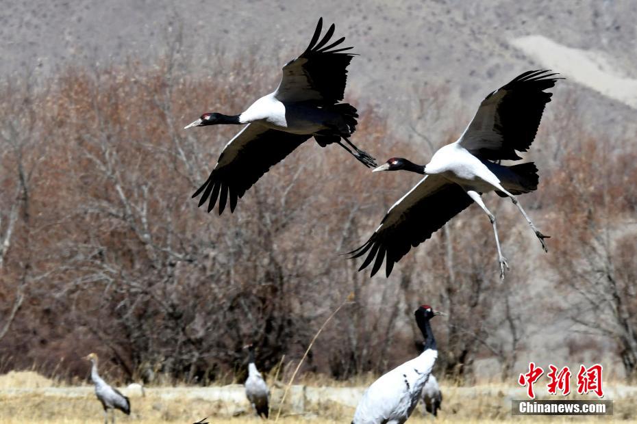 圖為11月21日,西藏日喀則市桑珠孜區(qū)邊雄鄉(xiāng),黑頸鶴振翅高飛。李林 攝