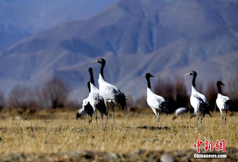 圖為11月21日,西藏日喀則市桑珠孜區(qū)邊雄鄉(xiāng),黑頸鶴在田間覓食、嬉戲。李林 攝