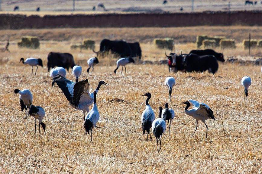 近日,大批黑頸鶴飛臨西藏自治區(qū)拉薩市林周縣越冬。黑頸鶴是國家一級保護(hù)動物。近年來,隨著當(dāng)?shù)厣鷳B(tài)保護(hù)力度越來越大,每年11月前后至次年3月底,來林周縣越冬的候鳥越來越多。