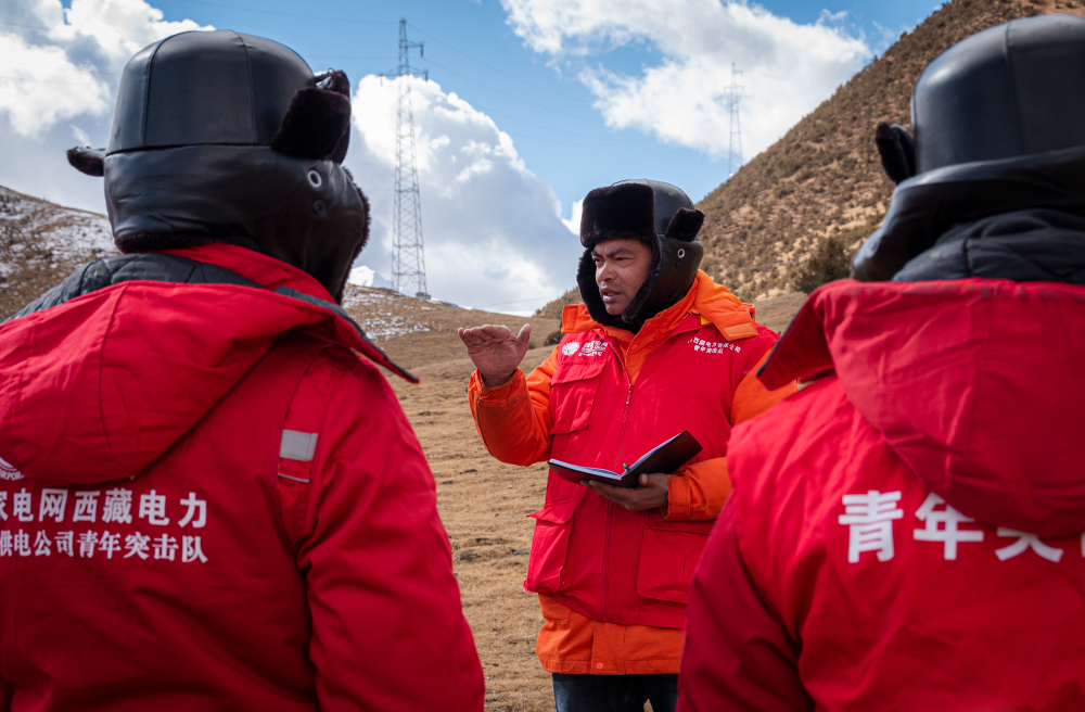 索縣榮布至丁青縣巴達(dá)35千伏線路工程負(fù)責(zé)人黃小洪在現(xiàn)場(chǎng)開展線路弧測(cè)量教學(xué)。(趙清鵬 攝)