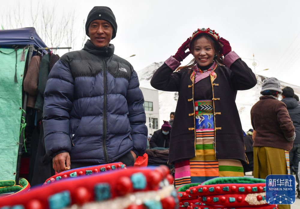 12月13日,西藏日喀則康馬縣冬季物資交流會上,一名婦女在挑選頭飾。