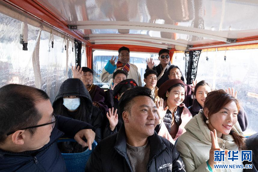 圖為墨竹工卡縣農(nóng)牧民帶表團(tuán)在南京高淳國(guó)際慢城景區(qū)觀光車內(nèi)合影留念(12月24日攝)。新華網(wǎng)發(fā) 李騰 攝