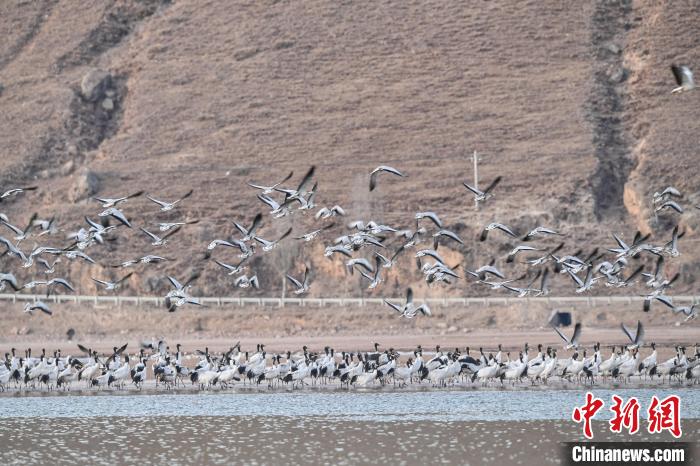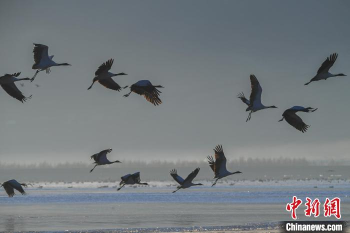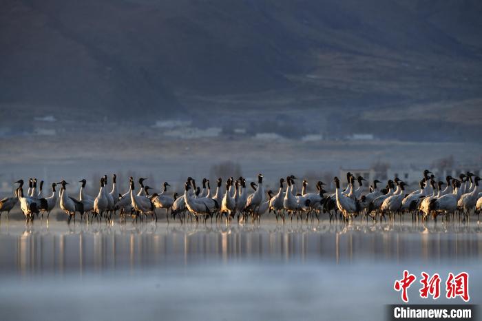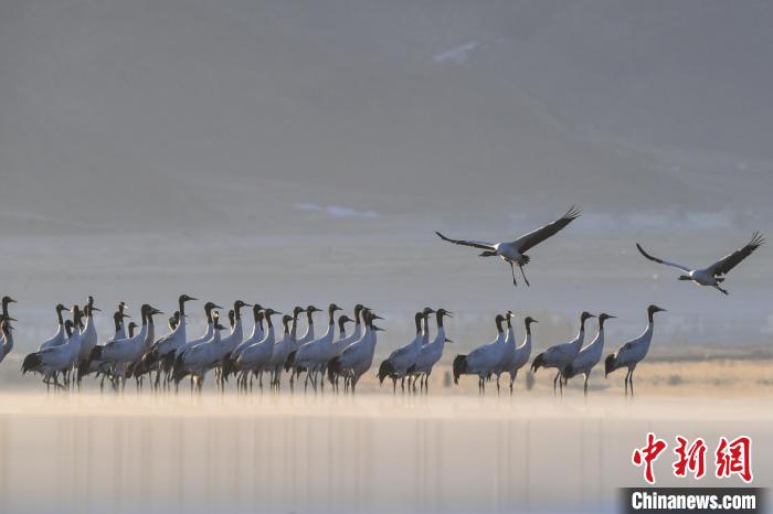 圖為拉薩市林周縣虎頭山水庫(kù)越冬的黑頸鶴。貢嘎來(lái)松 攝