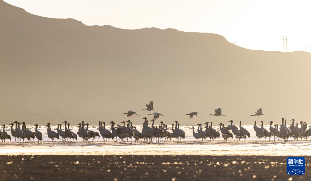 拉薩北部的林周縣平均海拔約4200米,是黑頸鶴的主要越冬地之一。清晨的陽光灑在林周縣虎頭山水庫,水面波光粼粼,鶴影婀娜多姿。