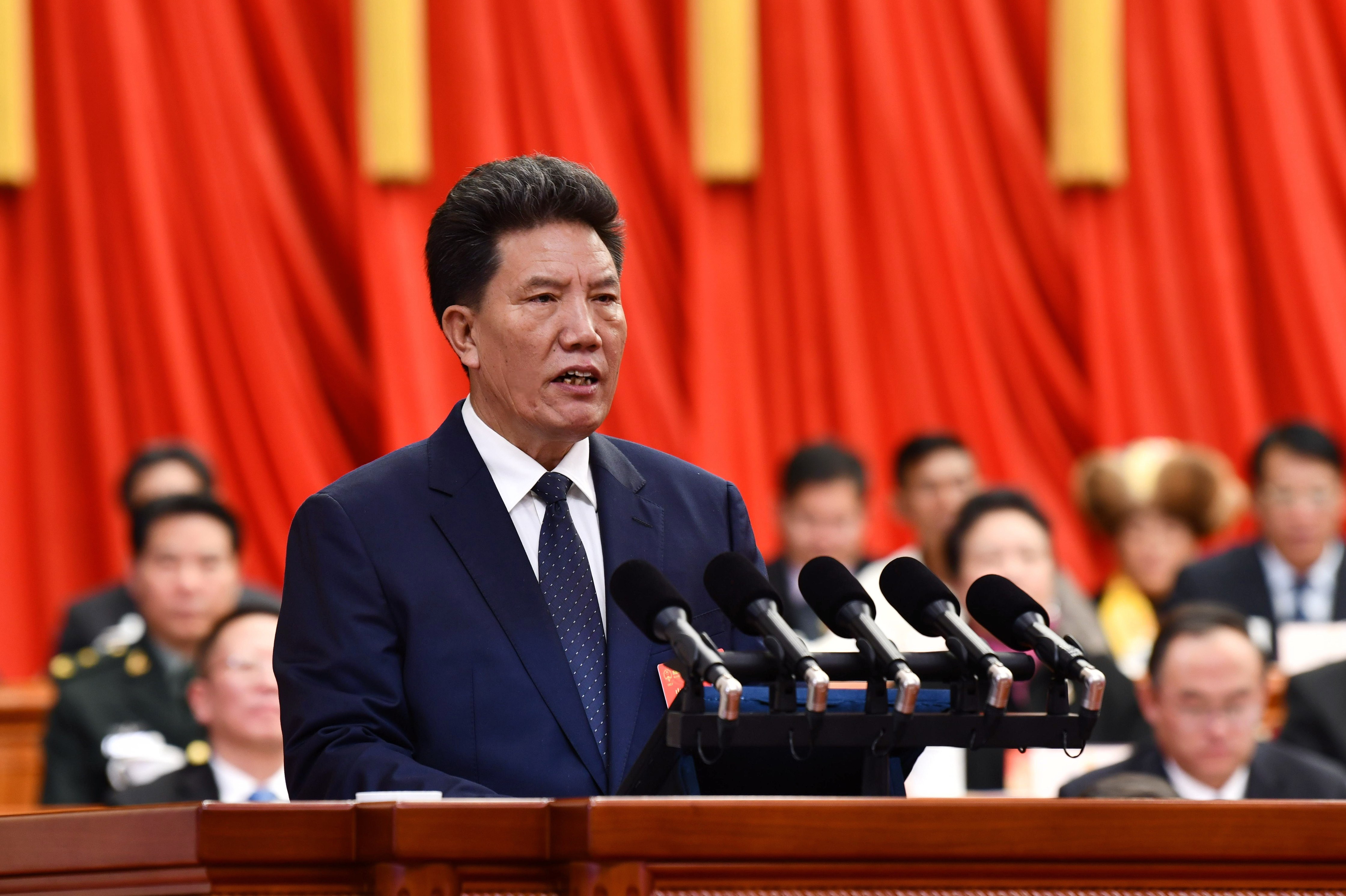 全國人大常委會副委員長、自治區(qū)人大常委會主任洛桑江村向大會作自治區(qū)人大常委會工作報告。記者 次仁平措 攝