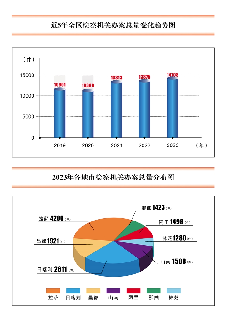 “2023年,全區(qū)檢察機(jī)關(guān)在自治區(qū)黨委和最高檢正確領(lǐng)導(dǎo)下,以習(xí)近平新時(shí)代中國特色社會(huì)主義思想為指導(dǎo),深入貫徹習(xí)近平法治思想、習(xí)近平總書記關(guān)于西藏工作的重要指示和新時(shí)代黨的治藏方略,全面貫徹黨的二十大精神、自治區(qū)第十次黨代會(huì)和十屆區(qū)黨委歷次全會(huì)精神、全國檢察長會(huì)議精神,認(rèn)真落實(shí)自治區(qū)十二屆人大一次會(huì)議決議,自覺把檢察工作放到黨的治藏穩(wěn)藏興藏大局中謀劃推進(jìn),聚焦‘四件大事’聚力‘四個(gè)創(chuàng)建’,忠誠依法能動(dòng)高質(zhì)效履職取得新成效。全年辦理各類法律監(jiān)督案件14708件,同比增長6%。依法主動(dòng)辦案8030件,占54.6%,主動(dòng)辦案量首次超過被動(dòng)受理案件量。‘四大檢察’結(jié)構(gòu)持續(xù)優(yōu)化為56∶18∶7∶19,業(yè)務(wù)質(zhì)效穩(wěn)步提升?!?月8日下午,西藏自治區(qū)人民檢察院檢察長夏克勤在西藏自治區(qū)第十二屆人民代表大會(huì)第二次會(huì)議上作工作報(bào)告。報(bào)告全面反映了西藏檢察機(jī)關(guān)一年來始終牢記“國之大者”,以實(shí)現(xiàn)“努力讓人民群眾在每一個(gè)司法案件中感受到公平正義”為目標(biāo),深入踐行“高質(zhì)效辦好每一個(gè)案件”,充分發(fā)揮檢察職能作用,在為大局服務(wù)、為人民司法、為法治擔(dān)當(dāng)中所做的主要工作,同時(shí)描繪了2024年的西藏檢察工作藍(lán)圖。