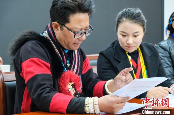 1月9日,西藏自治區(qū)兩會(huì)現(xiàn)場(chǎng),兩位珞巴族政協(xié)委員林勇(左)和布姆曲珍進(jìn)行討論、交流。中新社記者 江飛波 攝