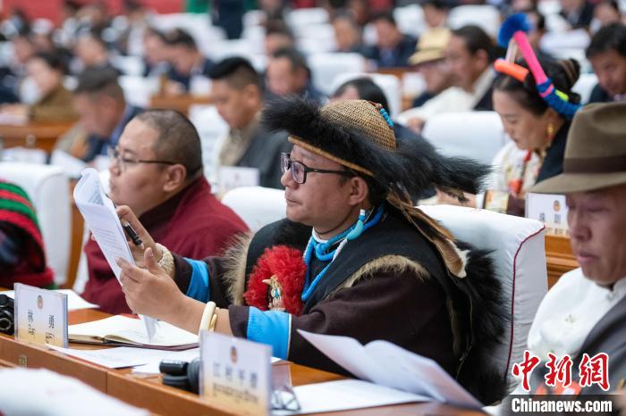 1月6日,西藏自治區(qū)兩會(huì)現(xiàn)場(chǎng),珞巴族政協(xié)委員林勇(中間者)參會(huì)。中新社記者 貢嘎來(lái)松 攝