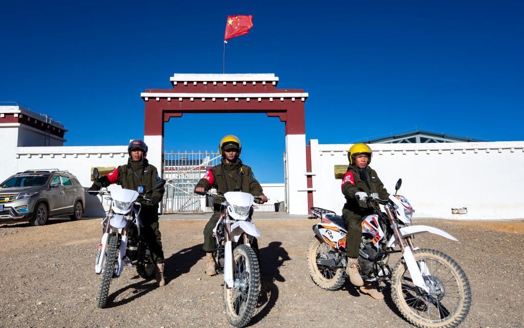 巡護(hù)隊(duì)員們騎上山地摩托車,準(zhǔn)備出發(fā)巡護(hù)(2023年12月17日攝)。新華社記者 姜帆 攝