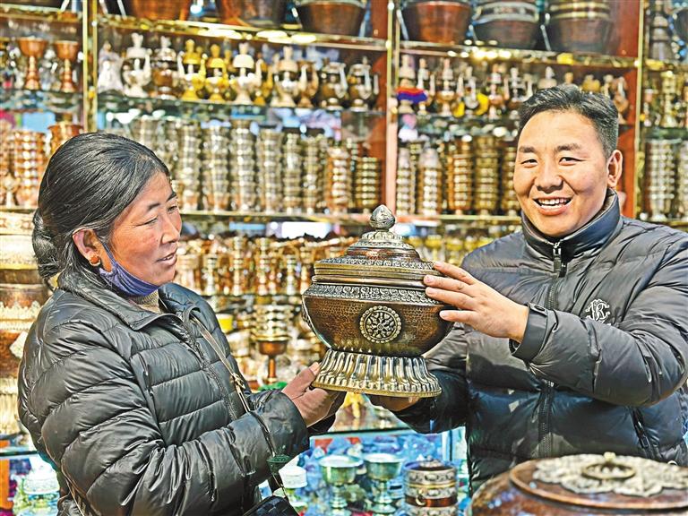 新年前夕,切瑪盒攤位的生意特別好?!敖衲曩I(mǎi)了新房,想購(gòu)買(mǎi)一個(gè)新的切瑪盒,母親喜歡純色,我們年輕人喜歡彩繪的,不過(guò)價(jià)格都特別實(shí)惠,我們?cè)偕塘可塘?。”市民次仁雍措?lè)呵呵地說(shuō)道。