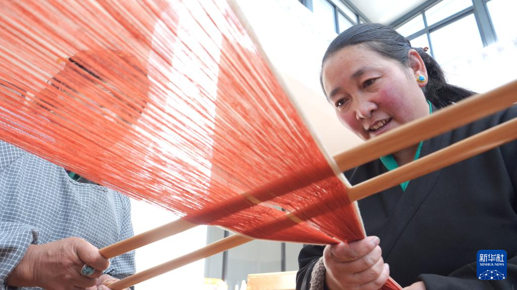 這是格桑卓瑪在幫助指導(dǎo)當(dāng)?shù)厝罕妼W(xué)習(xí)新織機(jī)用法。新華社記者 洛卓嘉措 攝