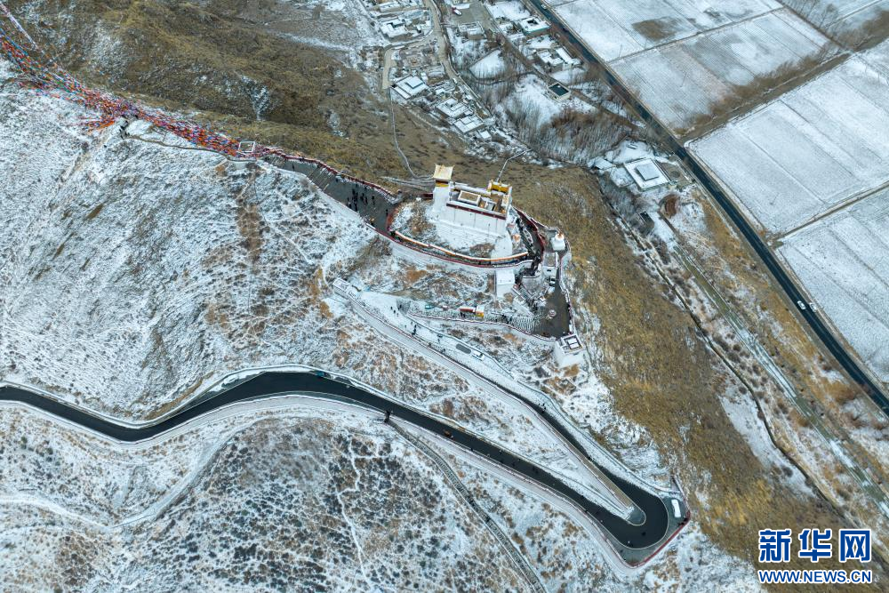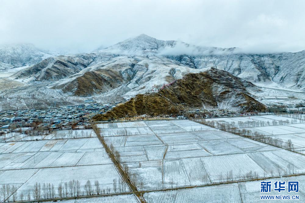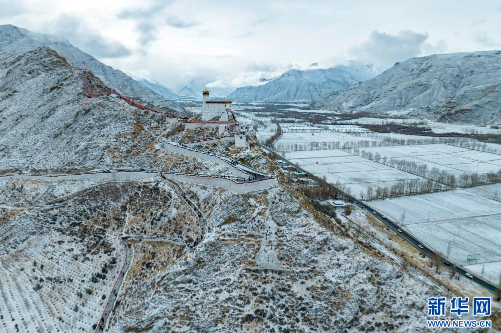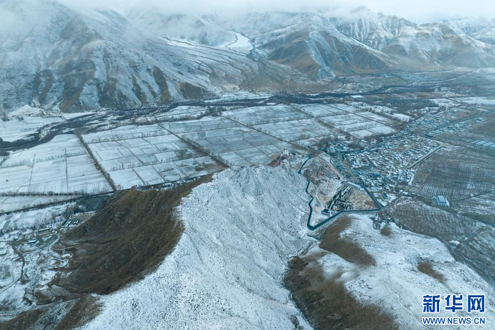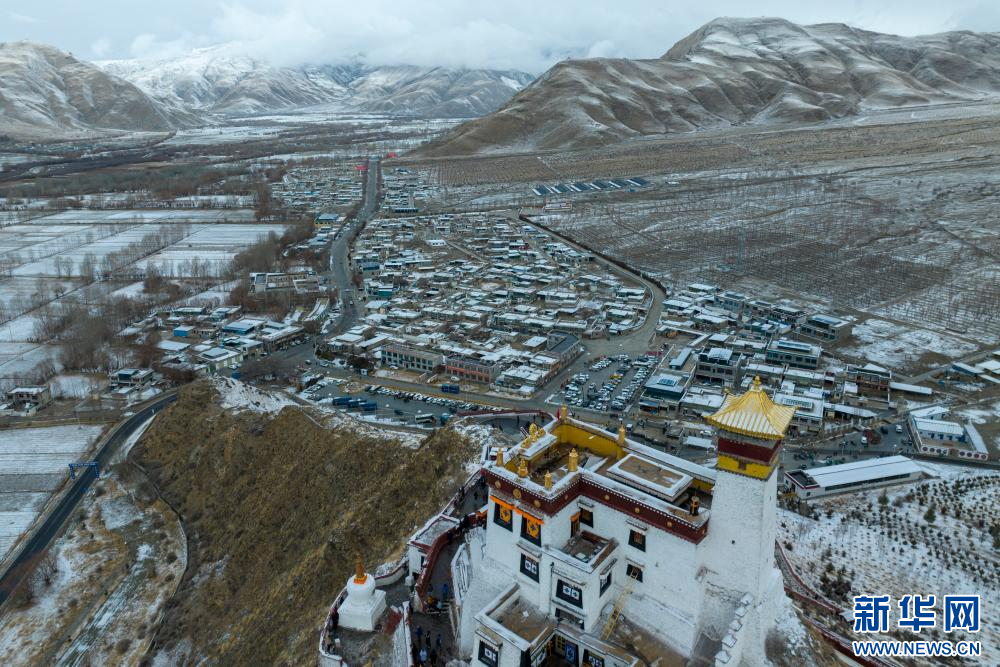 2月15日拍攝的雪后雍布拉康和山腳下的村莊(無(wú)人機(jī)照片)。新華網(wǎng) 旦增努布 攝