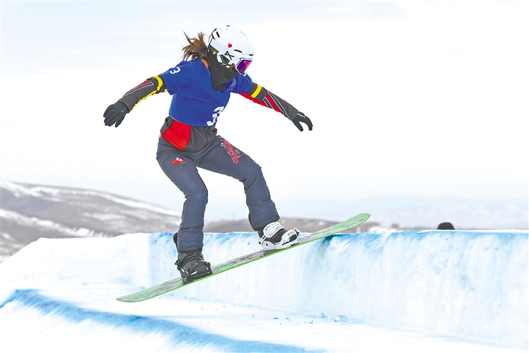 圖為西藏選手尼瑪擁青參加單板滑雪障礙追逐賽。洛桑 索朗群培 攝