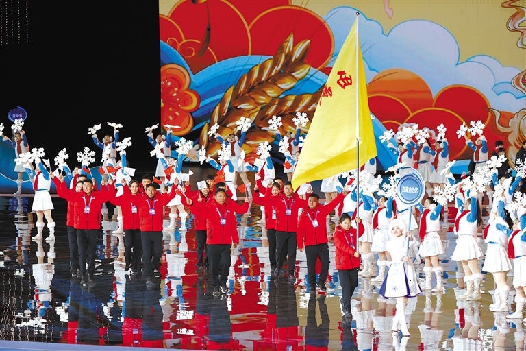 圖為西藏代表團(tuán)亮相第十四屆全國(guó)冬季運(yùn)動(dòng)會(huì)開(kāi)幕式。洛桑 索朗群培 攝
