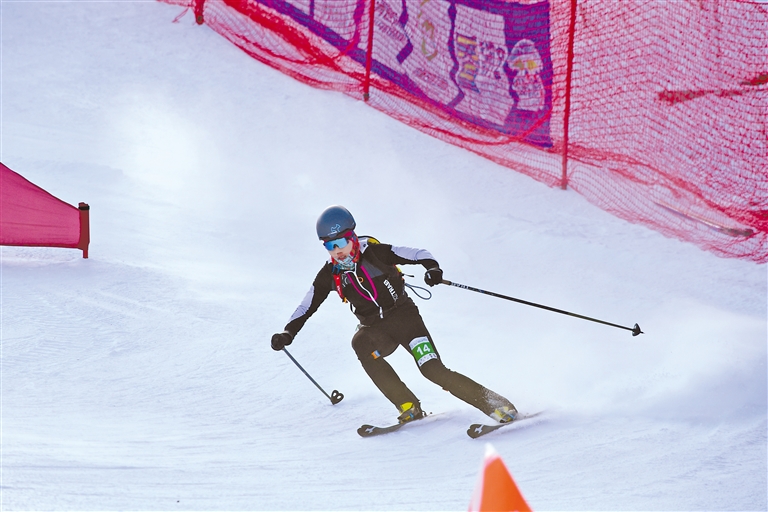 此次比賽共有兩條賽道,呈字母Y形,賽道全長(zhǎng)1100米,累計(jì)爬升130米。選手們分別需要完成兩次穿板上升、轉(zhuǎn)換下滑,然后在接力區(qū)身體觸碰完成接力,比賽充滿(mǎn)挑戰(zhàn)。