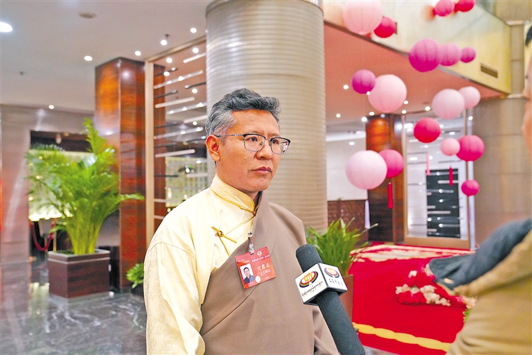 會議期間,住藏全國政協(xié)委員達瓦頓珠在委員駐地接受媒體采訪。