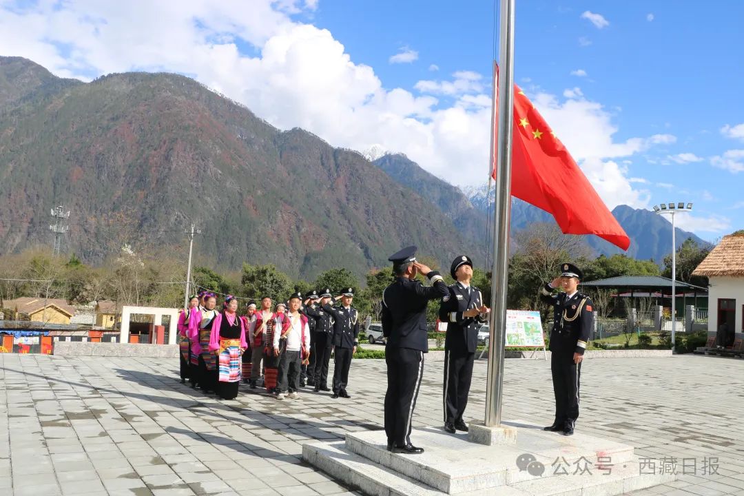 林芝邊境管理支隊竹瓦根邊境派出所與轄區(qū)干部群眾舉行紀念西藏百萬農奴解放65周年升旗儀式。