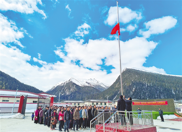 3月28日,米林市里龍鄉(xiāng)才巴村朗貢搬遷點的群眾舉行紀念西藏百萬農(nóng)奴解放65周年升國旗儀式。周宇 記者 丹增群培 攝