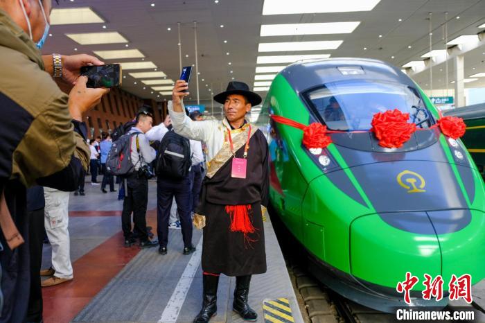 資料圖為2021年6月25日,西藏拉林鐵路開通運營,拉薩曲水縣三有村村民次旦平措在復(fù)興號前拍照留念。江飛波 攝