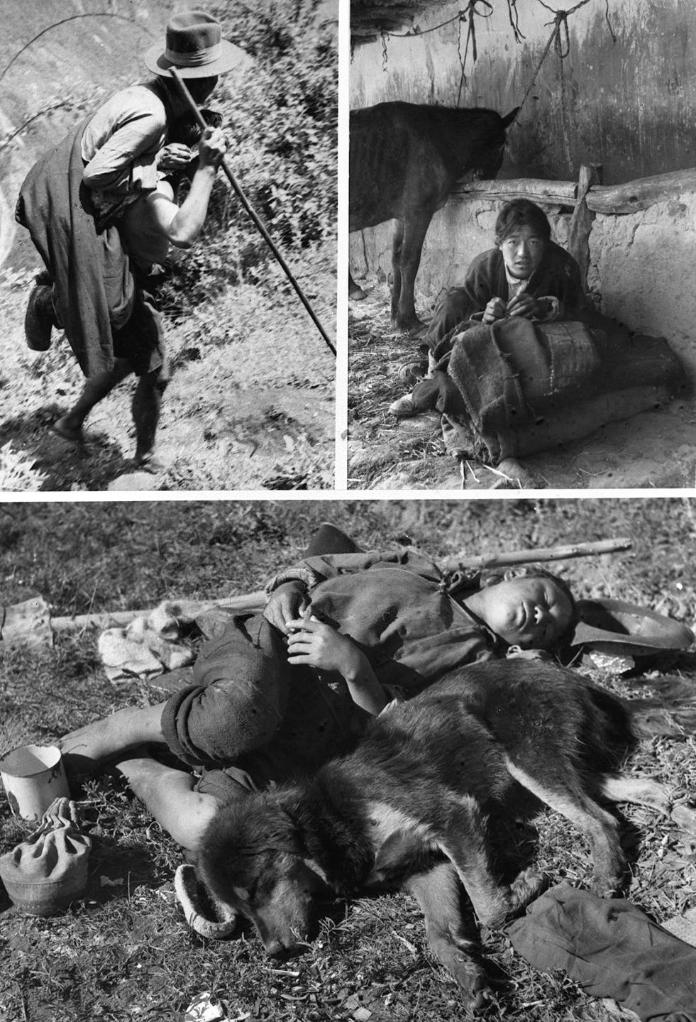 上圖左:西藏農奴制度下的“人背人”(即農奴背馱農奴主)差役。上圖右:和牲口同住的農奴。下圖:一位農奴服勞役后與犬同眠。(新華社發(fā))
