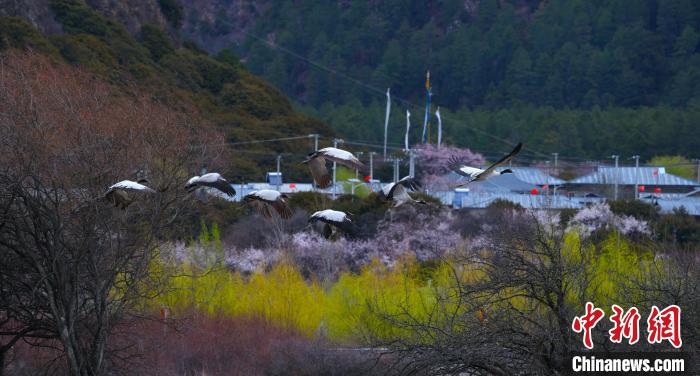圖為桃花前飛翔的黑頸鶴。貢嘎來松 攝