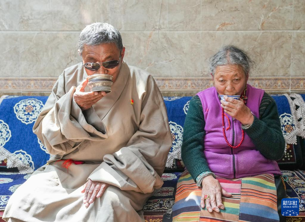 白瑪老人(左)和老伴多吉卓瑪在家中喝酥油茶(3月27日攝)。新華社記者 丁汀 攝
