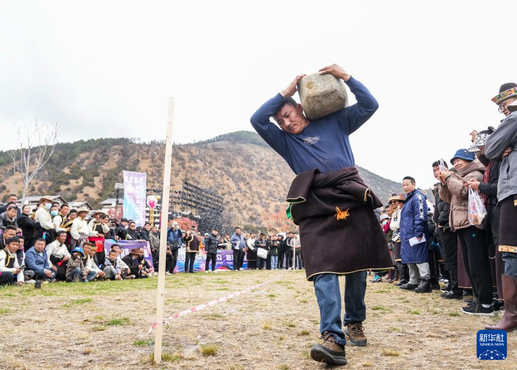 3月31日,在林芝市第二十一屆桃花旅游文化節(jié)民俗體育活動中拍攝的抱石頭比賽。新華社記者 丁汀 攝