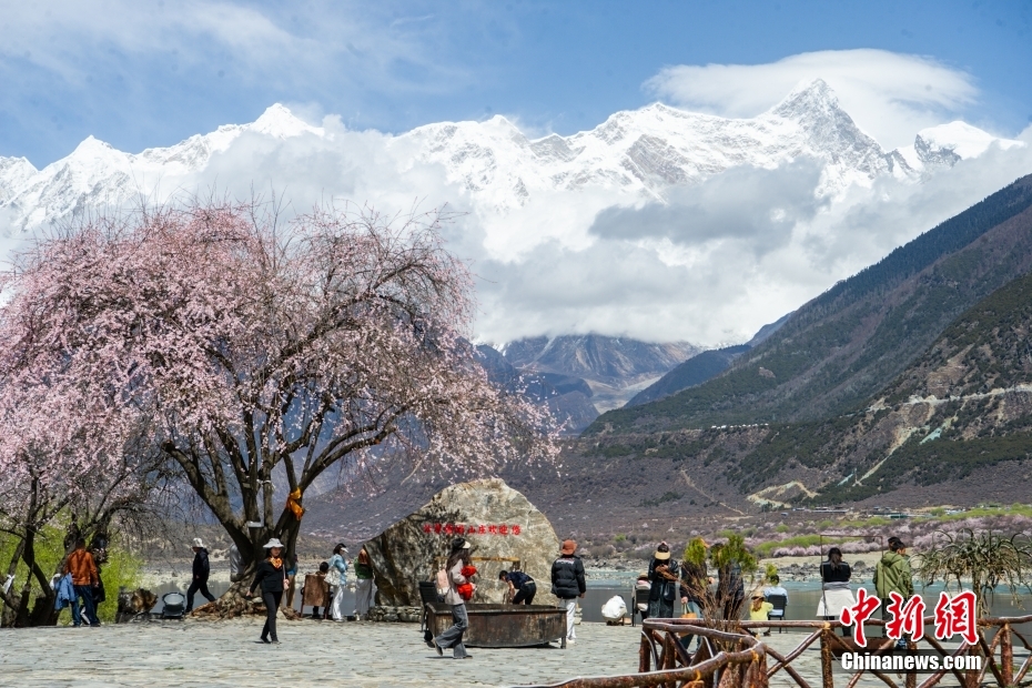 圖為游客在桃花樹(shù)下觀賞南迦巴瓦峰美景。中新社記者 貢嘎來(lái)松 攝