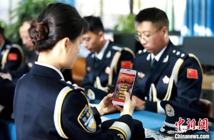 圖為移民管理警察旺青格列與海關(guān)緝私警察米瑪次仁觀看革命英烈宣傳片《犧牲在黎明》。肖富貴 攝