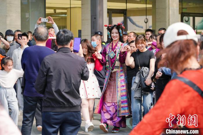 此次文旅推廣活動(dòng)中,主辦方在西子湖畔舉辦了一場(chǎng)藏裝時(shí)裝秀,十多位拉薩市當(dāng)雄縣藝術(shù)團(tuán)的演職人員身著各式藏裝獻(xiàn)上文藝表演、時(shí)裝走秀,吸引廣大游客駐足參與互動(dòng)。