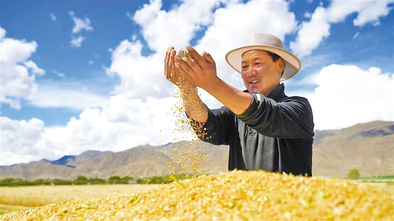 把牢“兩條底線”抓落實,確保國家糧食安全,確保不發(fā)生規(guī)模性返貧。2023年,西藏糧食生產(chǎn)再創(chuàng)佳績,共落實糧食播種面積291.88萬畝,其中青稞222.87萬畝,產(chǎn)量達108.87萬噸,耕地保護和糧食安全責任得到全面落實。完成續(xù)建和新建高標準農(nóng)田67.4萬畝,復(fù)耕撂荒地2.39萬畝。青稞良種覆蓋率達93%,主要糧食作物(青稞)耕種收綜合機械化率達71%以上。嚴格落實防返貧動態(tài)監(jiān)測幫扶機制,監(jiān)測范圍擴大至7000元(含)以下,組織開展防返貧監(jiān)測幫扶集中排查,強化部門預(yù)警聯(lián)動,落實“一戶一策”幫扶舉措,切實做到早發(fā)現(xiàn)、早干預(yù)、早幫扶。