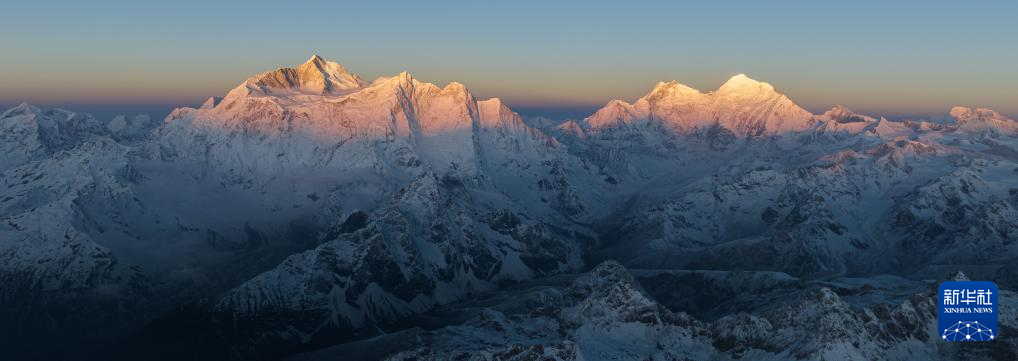 4月17日,晨光照耀嘎瑪溝及遠處的喜馬拉雅山脈,清晨的第一縷陽光與雪山相映成趣,形成“日照金山”景象。